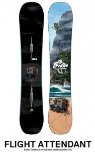 The Men’s Flight Attendant Snowboard features digital art and photography by Darshan Zenith. Roam where you want to. Four wheel drive, plus room to sleep and stow all your boards – “Movement is Improvement,” “Life is Love” the digital art and photography on the all mountain Flight Attendant was inspired by the ride-it-all ethos of the original adventure mobile.